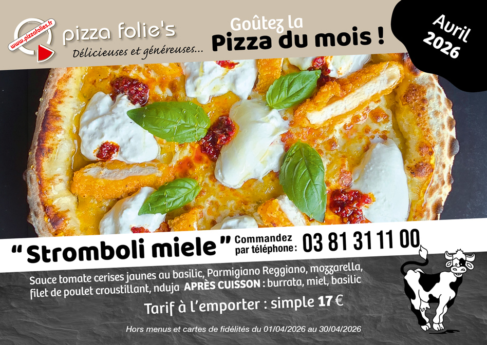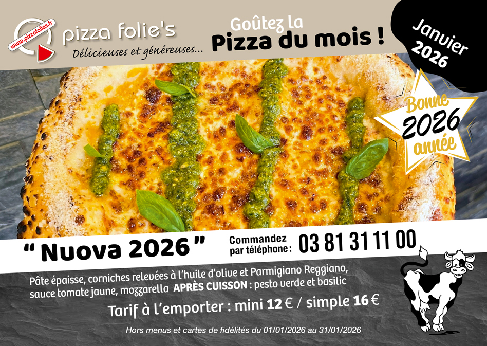 Depuis 1999 à Voujeaucourt, Pizza Folie’s vous régale avec ses « Délicieuses et généreuses » pizzas, pâtes, salades à emporter ou sur place. Un large choix de pizzas est proposé : « Traditions », « Gourmandes », « Étoilées » pour satisfaire tous les goûts.